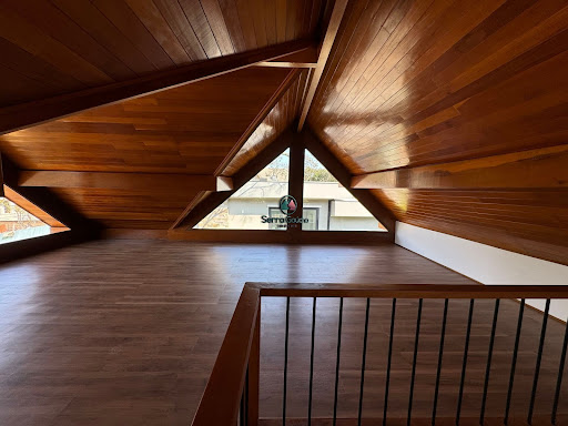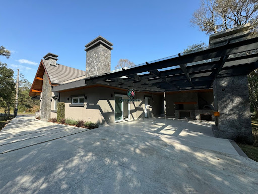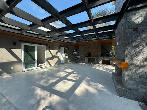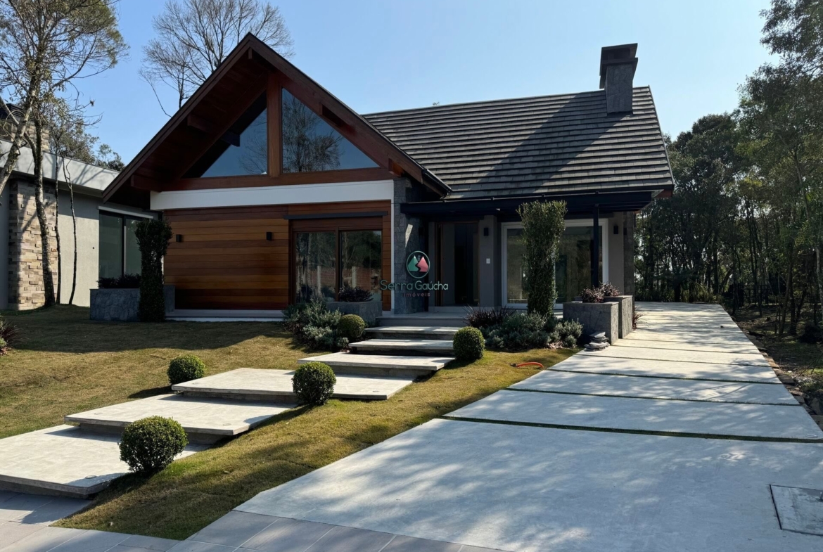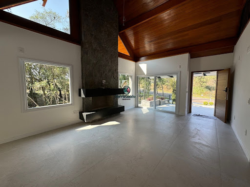 A casa é composta por 3 suítes, sendo uma com closet, banheiro com chuveiro duplo de teto e cuba dupla possui um espaçoso mezanino com grandes aberturas, o que traz uma ampla iluminação natural para os ambientes sociais da casa, forro e madeiramento em Grápia sala de estar com uma linda lareira, pé direito duplo e forro em Grápia, ambiente integrado com a sala de jantar e a cozinha, que possui churrasqueira tradicional lavanderia e espaço de despensa além disso, a residência dispõe de um vasto espaço gourmet com parrilla, forno iglu para pizza, lareira externa e lavabo, garagem para 2 carros com espera para estação de carregamento para veículos elétricos, depósito e casa de gás.